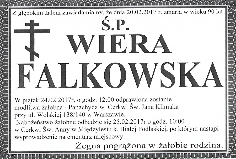 Wiera Falkowska z/d Sawczuk. Urodzona w 1926 r. w Matiaszówce, pow. Biała Podlaska. Podczas akcji “Wisła” osiedlona z rodziną we wsi Wójtowo, gm. Lutry, pow. Biskupiec. Po ukończeniu w 1956 r. SGGW pracowała w PWRN Warszawa (1956-1974), Instytucie Hodowli i Aklimatyzacji Roślin w Radzikowie (1974-1976), Centralnym Zarządzie Inspekcji Nasiennej w Warszawie (1976-1980), Wojewódzkim Zarządzie Inwestycji Rolniczych (1981-1987). Od powstania w 1956 r. UTSK była solistką chóru warszawskiego oddziału tej organizacji – “Dumka”, pod kier. Józefa Kuroczki, chóru cerkiewnego parafii prawosławnej na Woli, pod. kier. J. Kalinowskiego oraz chóru cerkiewnego o. bazylianów przy ul. Miodowej. Od przejścia na emeryturę jest członkiem chóru seniorów cerkwi na Woli.